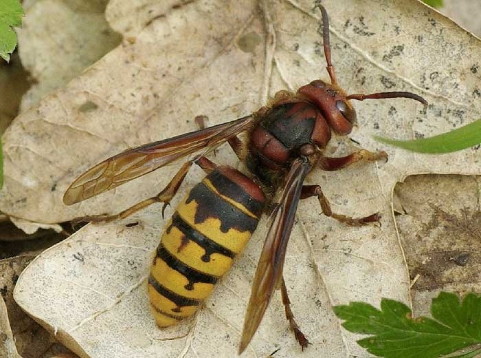 Le Vespa crabro, pouvant atteindre jusqu’à 3 cm de longueur, arbore des rayures jaunes et noires sur son abdomen, tandis que sa tête et son thorax sont d’une teinte rousse.